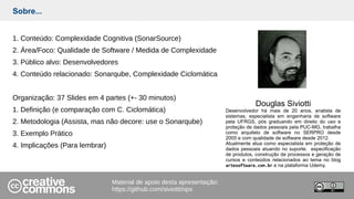 O documento apresenta uma introdução sobre a complexidade cognitiva, medida de qualidade de software que avalia a dificuldade de entendimento de código. Ele define a complexidade cognitiva, compara-a com a complexidade ciclomática e fornece um exemplo prático de cálculo. O documento também discute a metodologia de cálculo da complexidade cognitiva e suas vantagens em relação à complexidade ciclomática.