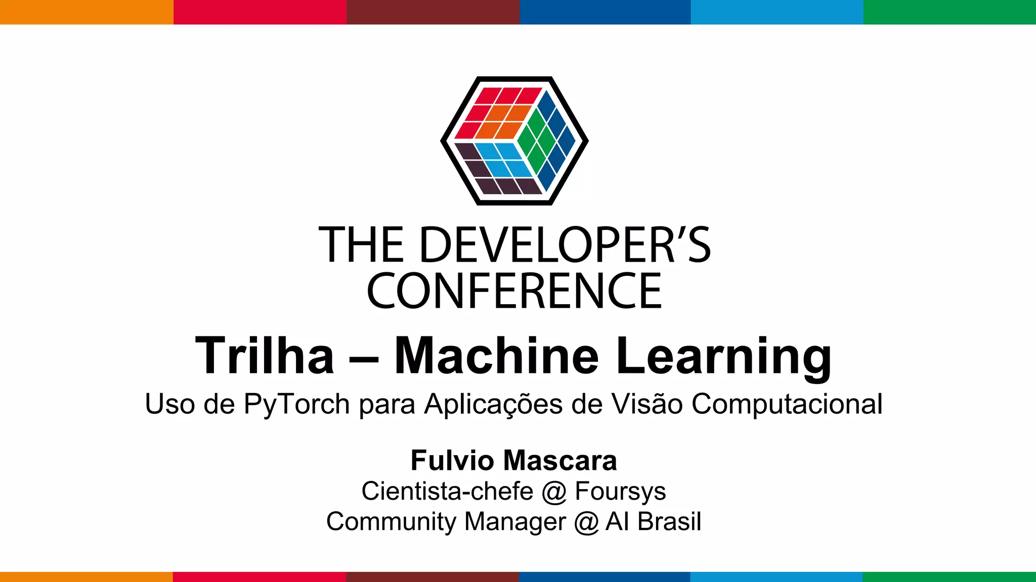 O documento apresenta PyTorch, um framework de aprendizado profundo em Python. Discute características como tensores, operações com tensores e gradientes automáticos. Também cobre visão computacional com CNNs usando bibliotecas como torch.nn, torch.nn.functional e torchvision.