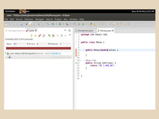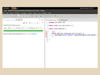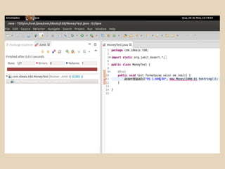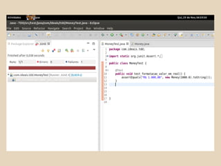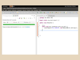 O documento apresenta os conceitos e princípios do Test Driven Development (TDD), abordando o que é TDD, suas vantagens como feedback instantâneo e design evolutivo, e como funciona o ciclo Red-Green-Refactor. Também discute questões como os tipos de testes, princípios como KISS e YAGNI, e mitos e confusões sobre TDD.