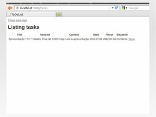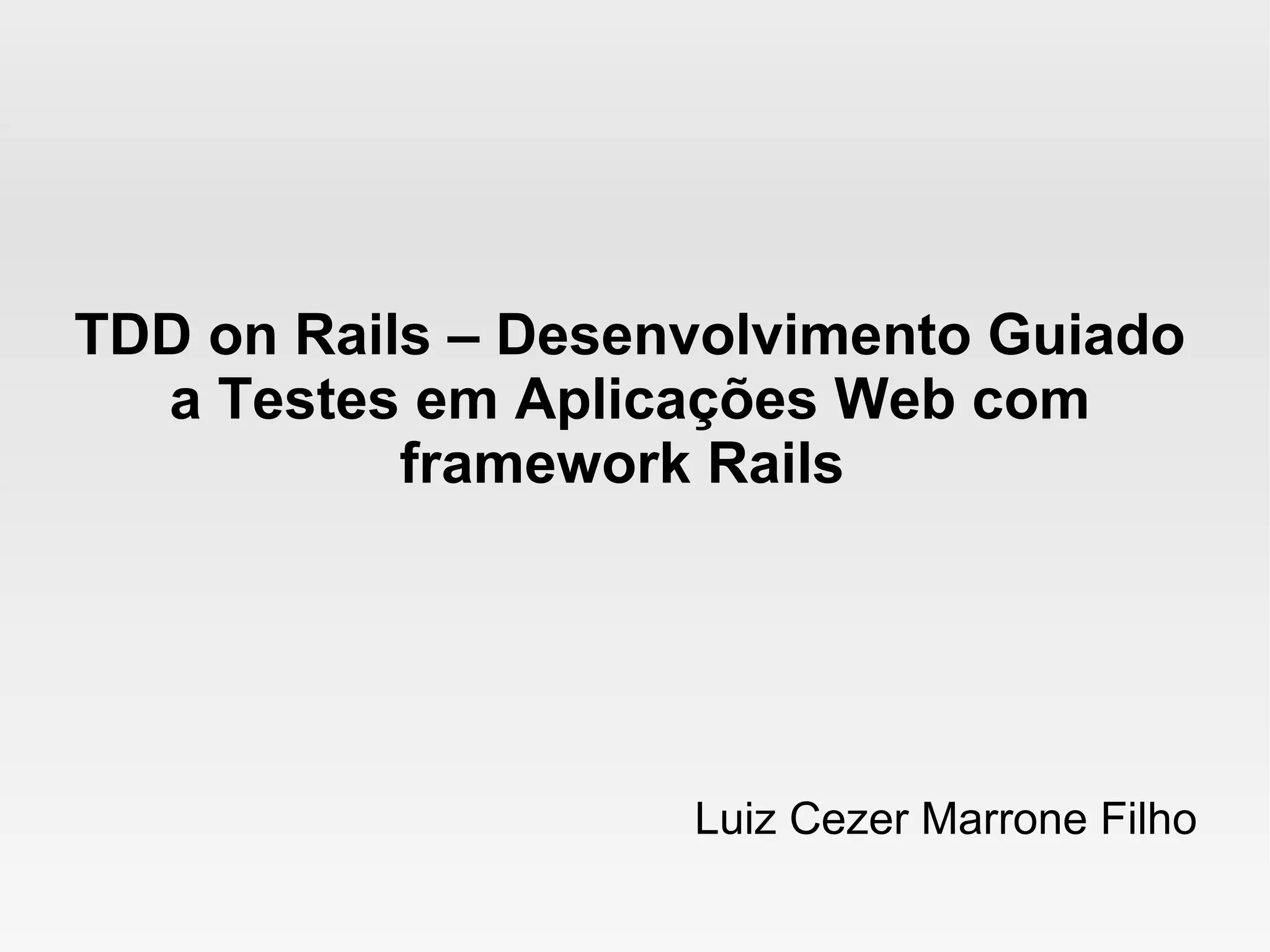 Este documento descreve o uso da metodologia de desenvolvimento guiado por testes (TDD) em aplicações web construídas com o framework Rails. Apresenta os conceitos de TDD, Ruby e Rails, e realiza um estudo experimental aplicando TDD em uma aplicação simples para demonstrar os benefícios dessa abordagem, como melhoria na qualidade do código e compreensão dos requisitos.