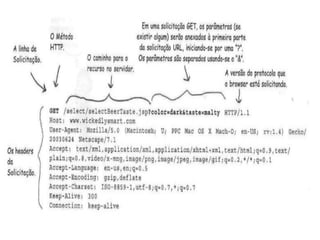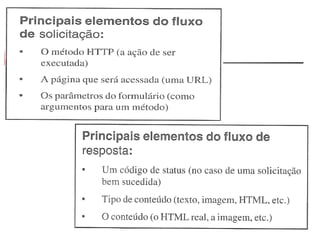 O documento discute os fundamentos da arquitetura web, incluindo a diferença entre clientes e servidores web, como eles se comunicam usando HTML e HTTP, e os métodos GET e POST. Também aborda conceitos como páginas estáticas e dinâmicas, URLs e o uso de servlets e CGI para gerar conteúdo dinâmico.