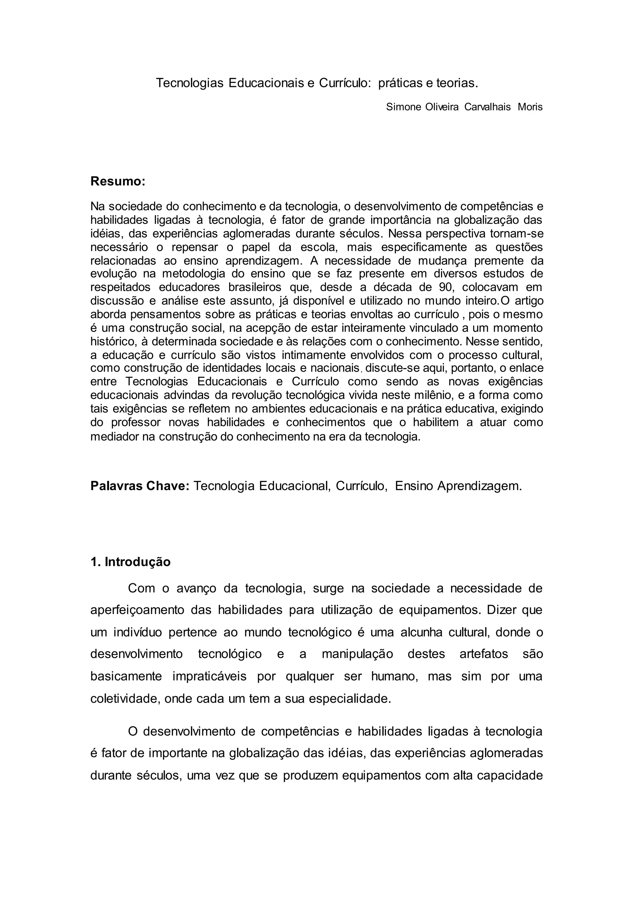 O documento discute as relações entre tecnologias educacionais e currículo. Apresenta como o avanço tecnológico exige novas competências e habilidades e como isso impacta a escola e o processo de ensino-aprendizagem. Também aborda como as tecnologias podem ser incorporadas na educação de forma a enriquecer o ambiente educacional e propiciar a construção do conhecimento.
