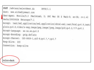 import javax.servlet.*; importjavax.servlet.http.*; import java.io.*; public class BeerSelect extends HttpServlet { public void doPost(HttpServletRequest request, HttpServletResponse response) throws IOException, ServletException{ response.setContentType("text/html"); PrintWriter out = response.getWriter(); out.println("Beer Selection Advice<br>"); String c = request.getParameter("color"); out.println("<br>Got beer color " + c); } }
