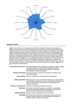 José é um perfil comportamental que valoriza as relações humanas e o trabalho em equipe. Ele demonstra empatia, escuta ativa e disposição para apoiar os outros. José também gosta de completar tarefas de forma eficaz e promover harmonia no ambiente de trabalho. Uma de suas limitações é evitar conflitos e divergências.