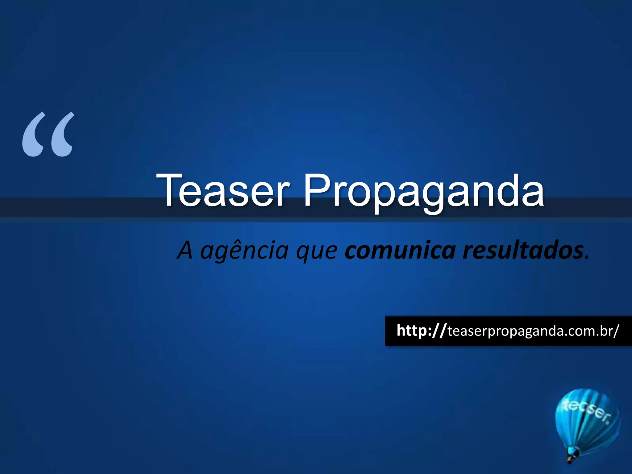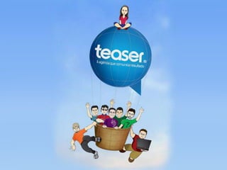 O documento descreve a estrutura organizacional e os serviços oferecidos pela agência de propaganda Teaser. A agência possui 5 setores principais: atendimento, planejamento, criação offline, criação online e mídia. Cada setor é liderado por um diretor e conta com uma equipe multidisciplinar responsável por planejar e executar campanhas de publicidade.