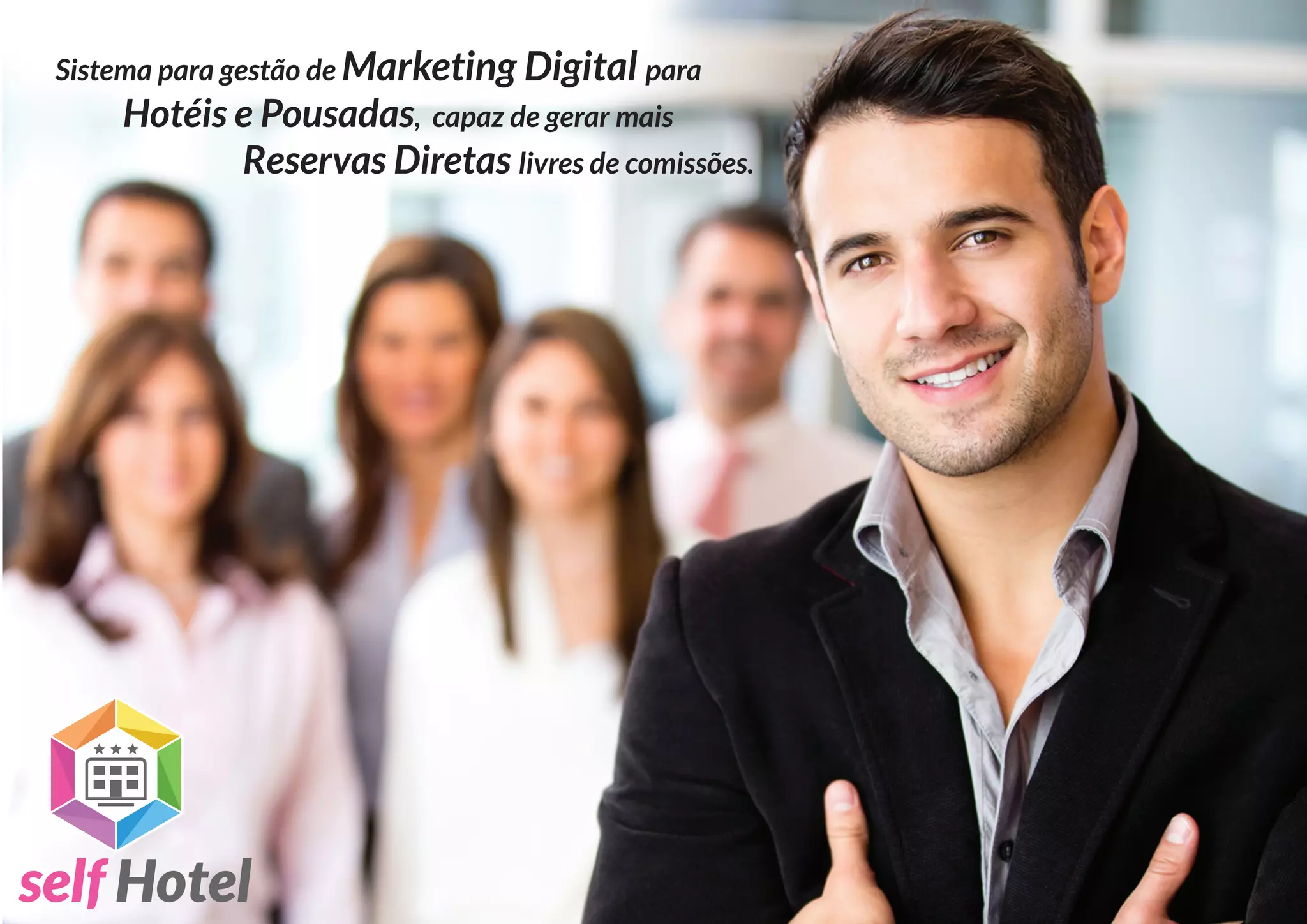 Este documento descreve um sistema de gestão de marketing digital para hotéis e pousadas chamado self Hotel que pode gerar mais reservas diretas sem comissões. Ele ajuda hotéis a superar problemas com custos de vendas, conhecimento e acesso a ferramentas, oferecendo um site focado em vendas com motor de reservas integrado, auxílio em divulgação e relatórios analíticos.