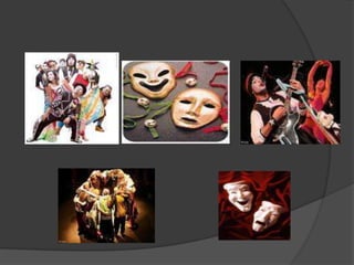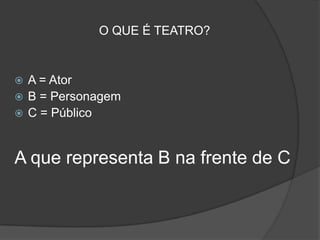 O documento fornece informações sobre o que é teatro, sua origem na Grécia antiga e nos rituais de sociedades primitivas, e descreve os principais elementos dos teatros gregos e tipos de palcos. Também lista dicas para escrever textos teatrais, enfatizando a importância da história, caracterização dos personagens e dinâmica emocional na ação.