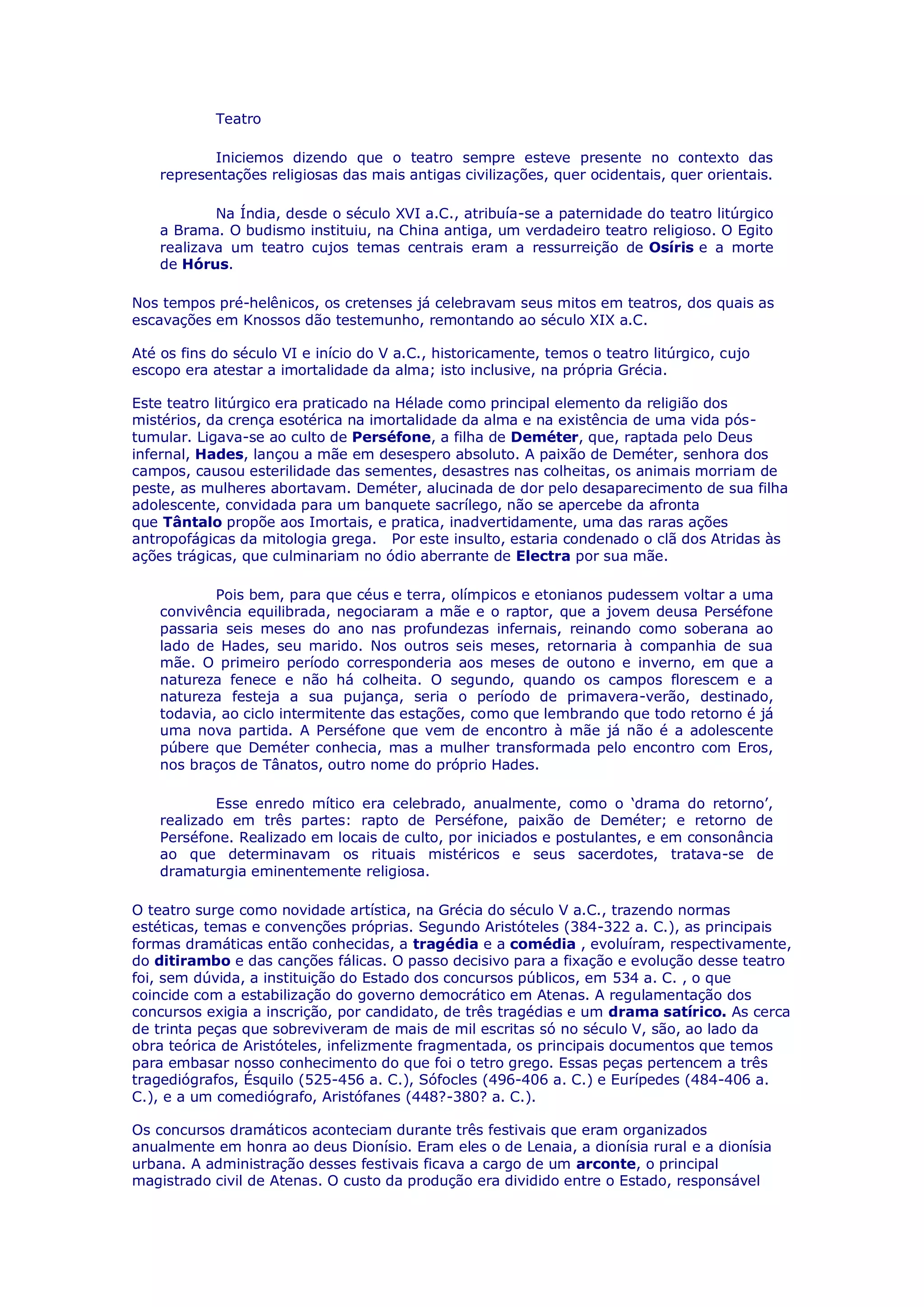O teatro tem origem nas representações religiosas de civilizações antigas. Na Grécia antiga, o teatro litúrgico celebrava mitos como o de Perséfone e era realizado em locais sagrados. Posteriormente, o teatro grego evoluiu como arte, com normas estéticas próprias e formas como a tragédia e a comédia.