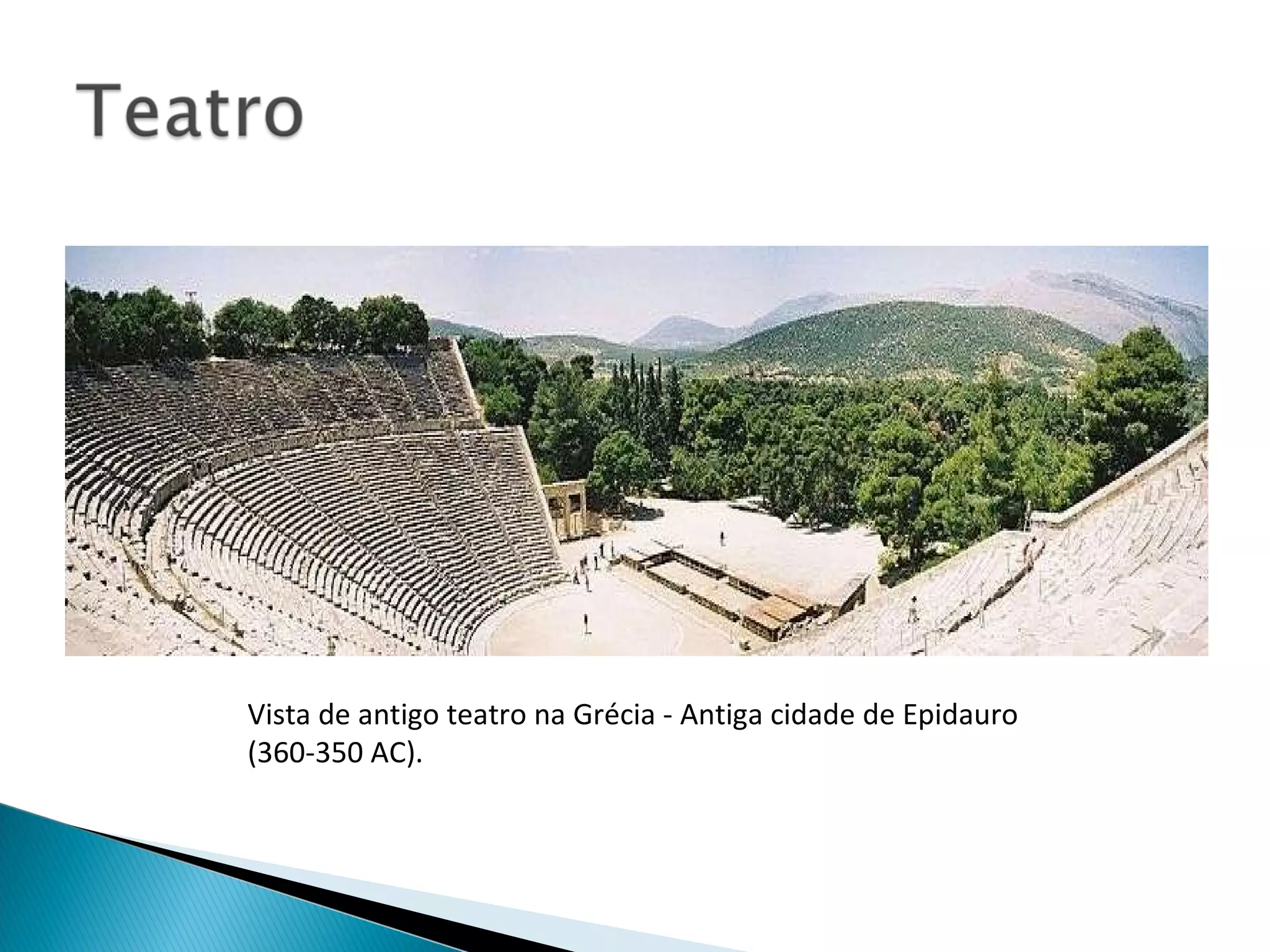 1) O teatro surgiu na Grécia antiga nos festivais dedicados a Dionísio no século IV a.C.