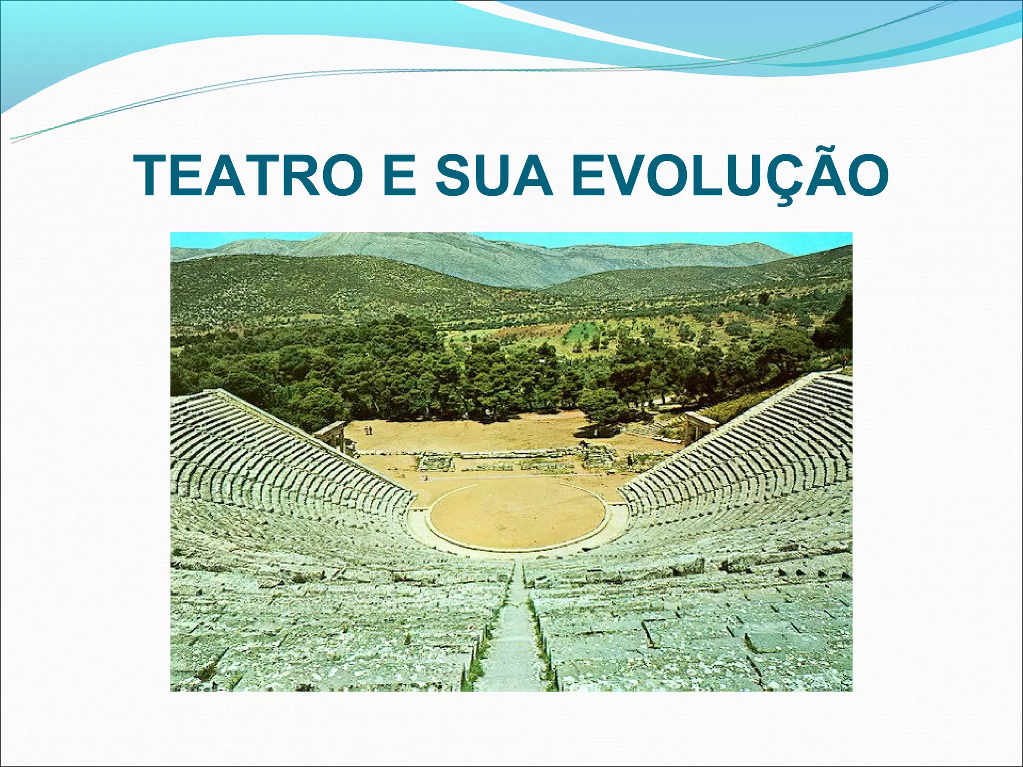 O teatro evoluiu de rituais gregos antigos como o ditirambo até se tornar uma arte performática complexa. Os gregos desenvolveram os primeiros teatros de pedra e estabeleceram os gêneros de tragédia, comédia e drama satírico, que ainda influenciam o teatro moderno.