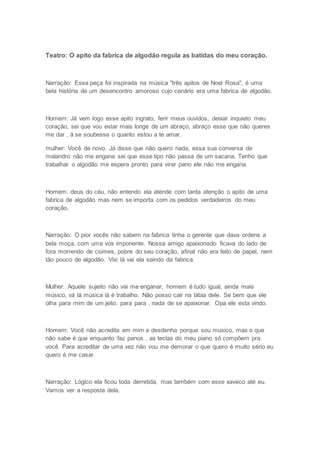 Esta peça de teatro é inspirada na música "Três Apitos de Noel Rosa" e conta a história de um homem apaixonado por uma mulher que trabalha em uma fábrica de algodão. Ele tenta conquistá-la, mas ela desconfia dele por ser músico. No final, ele a pede em casamento e ela aceita, ficando os dois felizes.