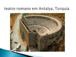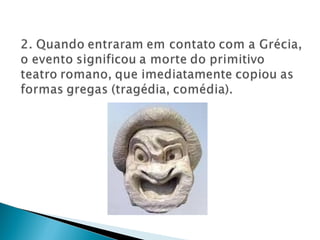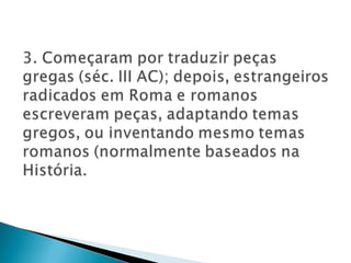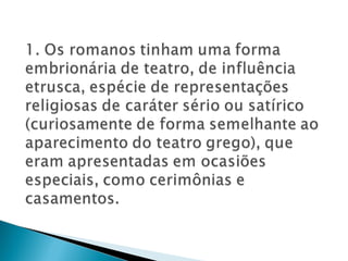 O documento descreve a história do teatro romano. Começou com peças traduzidas do grego no século III a.C. e evoluiu para comédias nativas no século II a.C. No período imperial, os espetáculos se tornaram mais espetaculares e violentos para agradar o público, como combates de gladiadores. Isso foi usado pelos imperadores para distrair o povo das condições de vida precárias.