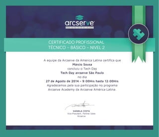 O documento é um certificado de conclusão de treinamento técnico básico da Arcserve para Márcio Sousa. Ele participou de um Tech Day em São Paulo em 27 de agosto de 2014, das 9h às 12h, e concluiu com sucesso o programa de treinamento da Arcserve Academy na América Latina.