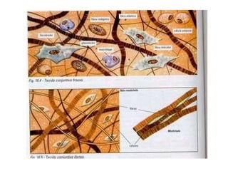 O tecido conjuntivo apresenta células separadas por matriz intercelular e é vascularizado, exceto o cartilaginoso. Existem três tipos principais: frouxo, denso não modelado e denso modelado. Há também tecidos conjuntivos especiais como o adiposo, cartilaginoso, ósseo e sanguíneo. As células do tecido conjuntivo frouxo incluem fibroblastos, macrófagos, mastócitos e plasmócitos.