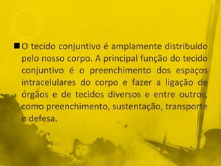 O tecido conjuntivo é um tecido que preenche espaços no corpo e conecta órgãos. Ele origina-se da mesoderme fetal e é composto de células, fibras de colágeno, elastina e reticulina, e substância fundamental. O tecido conjuntivo ocorre em diferentes formas com funções mecânicas variadas.