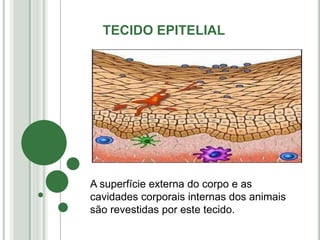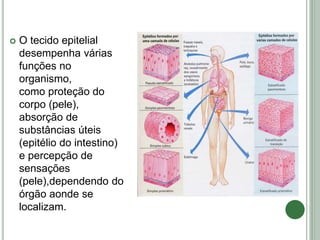 O tecido epitelial reveste a superfície externa e as cavidades internas do corpo, desempenhando funções como proteção, absorção e percepção. É formado por células justapostas sem vascularização. Pode ser classificado quanto ao número de camadas celulares (uni ou multiestratificado), forma das células (pavimentoso, cúbico ou prismaticas) e função (revestimento ou glandular).