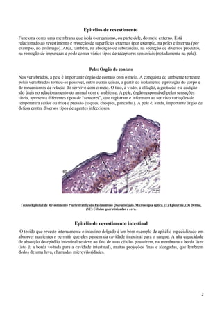 O documento descreve os tipos principais de tecidos epiteliais no corpo humano. Inclui epitélios de revestimento, que recobrem a pele e órgãos internos, e epitélios glandulares, que secretam substâncias. Detalha como os epitélios de revestimento da pele e intestino desempenham funções importantes de proteção, absorção e sensação.