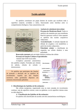 O documento descreve os principais tipos de tecido epitelial no corpo humano. Apresenta uma introdução sobre tecidos e, em seguida, detalha os epitélios de revestimento simples e estratificados, além dos epitélios glandulares exócrinos e endócrinos. Explica a classificação, estrutura e funções destes tecidos que recobrem superfícies e formam glândulas no organismo.