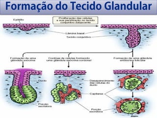 O documento descreve as características gerais dos tecidos glandulares, incluindo a natureza dos produtos secretados (hormônios, substâncias graxas, proteínas), a constituição das glândulas (cápsula, lóbulos, ductos) e a classificação delas de acordo com o método de distribuição dos produtos secretados (exócrinas, endócrinas, mistas).