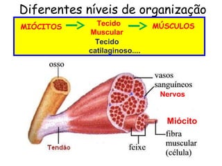 O documento descreve a estrutura e função do músculo esquelético, incluindo os componentes da contração muscular como actina e miosina, e os mecanismos da contração e relaxamento muscular mediados pelo cálcio. Também discute os tipos de tecidos musculares e as fontes de energia para a musculatura durante exercícios de curta, média e longa duração.