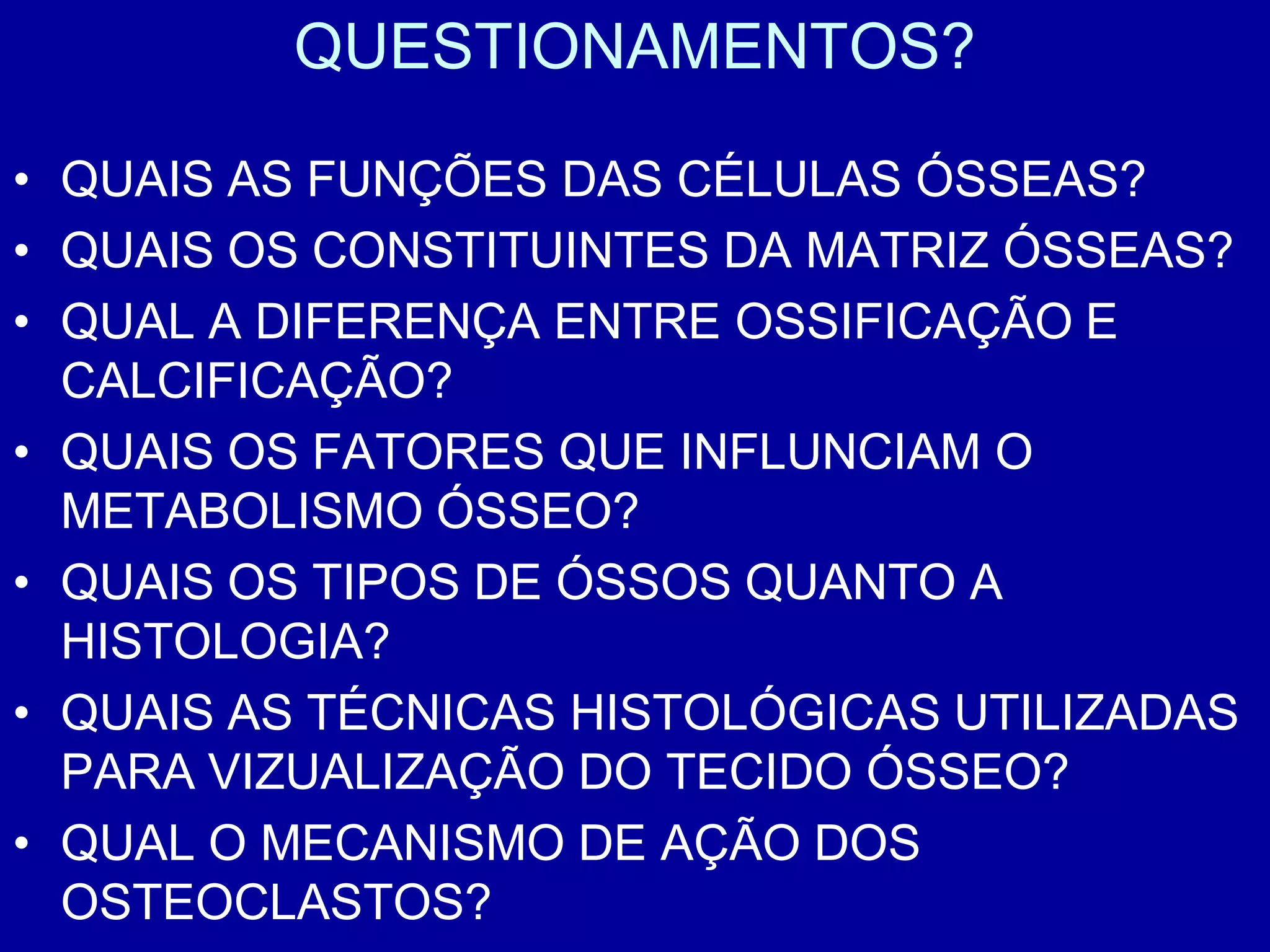 O documento apresenta perguntas sobre diversos tópicos relacionados ao tecido ósseo, incluindo suas funções, células, matriz óssea, ossificação, calcificação, remodelação e técnicas histológicas.