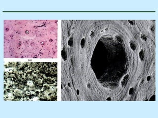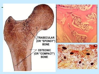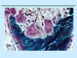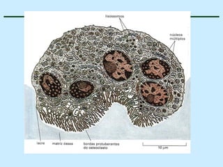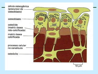 O documento descreve as características do tecido ósseo, incluindo sua composição orgânica e inorgânica, as células que o compõem, como os osteoblastos, osteócitos e osteoclastos, e suas funções no corpo. Também aborda os processos de formação, crescimento e remodelamento ósseo ao longo da vida, bem como distúrbios como a osteoporose.