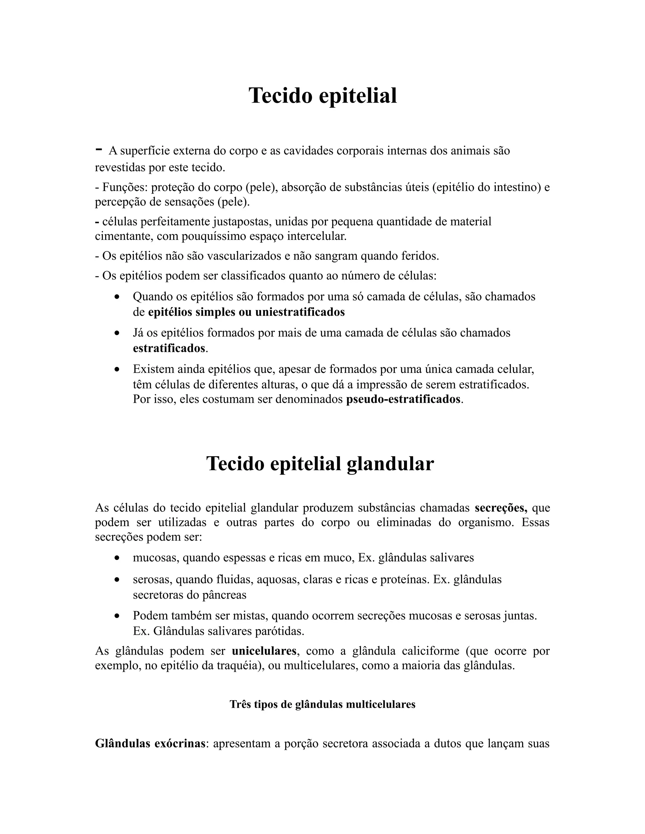 O documento descreve o tecido epitelial, que reveste a superfície externa e cavidades internas do corpo. Pode ser classificado como simples ou estratificado e protege o corpo, absorve substâncias e percebe sensações. Também descreve o tecido epitelial glandular, que produz secreções como muco ou fluidos, podendo ser unicelular ou multicelular.