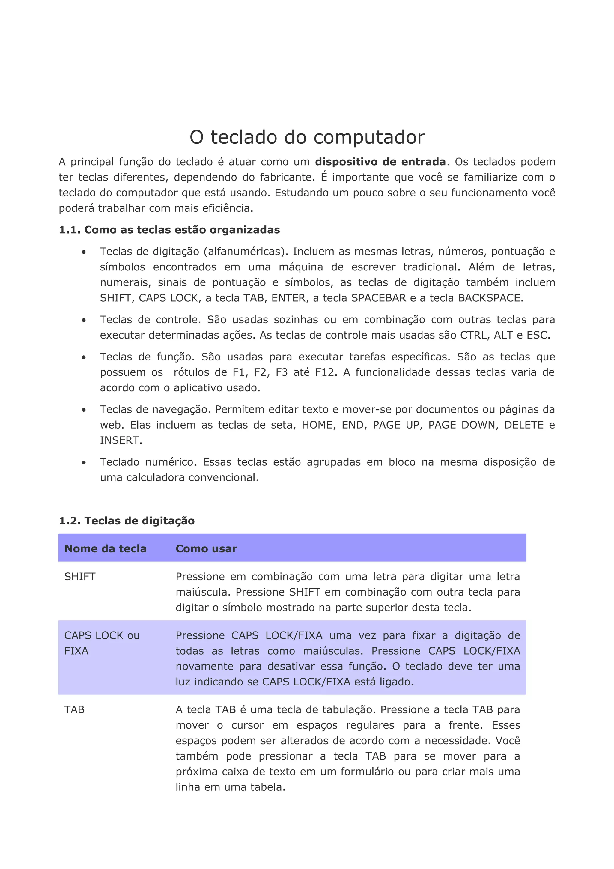 O documento descreve as principais partes e funções do teclado de computador, incluindo teclas de digitação, controle, função e navegação. Ele também fornece dicas sobre como usar o teclado corretamente para evitar lesões.