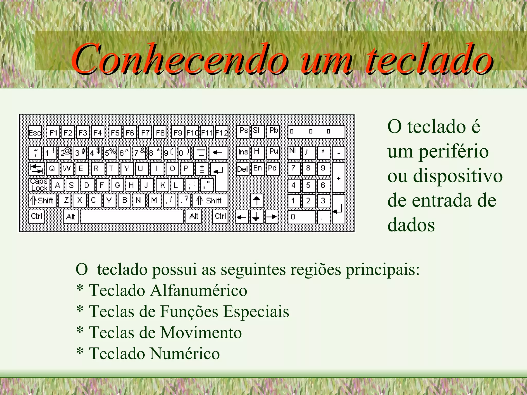O documento descreve as principais partes de um teclado de computador: o teclado alfanumérico, as teclas de funções especiais, as teclas de movimento e o teclado numérico. Explica o funcionamento das teclas como SHIFT, CAPS LOCK, BACKSPACE e ENTER, assim como as teclas de função F1-F12, ALT, CTRL e as setas de movimentação. Detalha também o uso do teclado numérico e da tecla NUM LOCK.