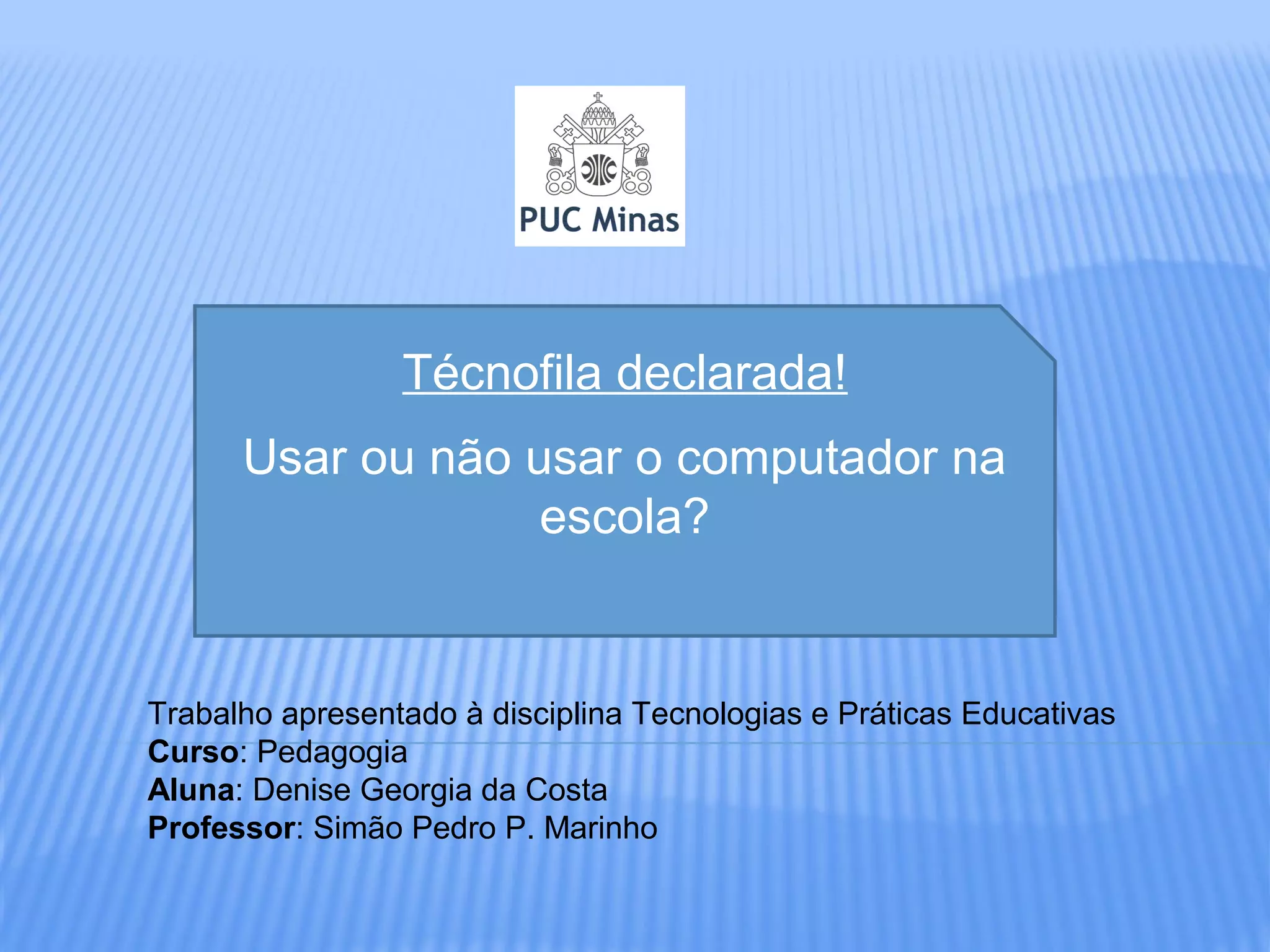 O documento discute os benefícios do uso de computadores na educação escolar. A tecnologia está cada vez mais presente na vida das crianças e pode ser usada de forma a tornar as aulas mais interessantes e atrativas, contribuindo para o desenvolvimento cognitivo dos alunos. O documento defende que os computadores devem ser utilizados com jogos e simulações pedagógicas, pesquisas na internet e de forma a conectar os alunos ao mundo.