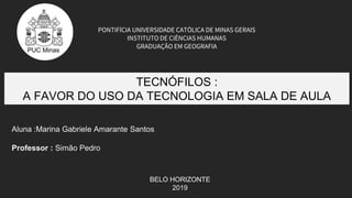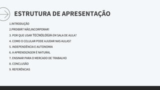 Este documento defende o uso da tecnologia em sala de aula, especificamente o celular. Afirma que proibir seu uso faz os alunos se sentirem presos e que as escolas deveriam incorporá-lo como recurso de ensino. Argumenta que o celular permite pesquisas, criação de conteúdo e projetos colaborativos, além de gerar independência e autonomia dos alunos. Conclui que a escola deve preparar os estudantes para o mercado de trabalho, que busca por habilidades como comunicação, pesquisa e uso