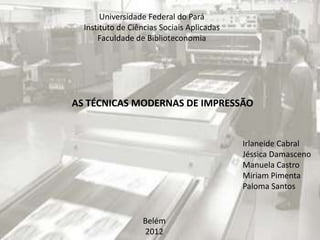 O documento descreve as técnicas modernas de impressão, começando com a transformação da tipografia de um artesanato para uma indústria durante a era industrial. Detalha as invenções que possibilitaram essa mudança como a prensa mecânica e o linotipo, e discute os resultados de maior produção e surgimento dos grandes jornais. Também apresenta as diferentes técnicas de impressão como a xilogravura, litografia e gravura mecânica.