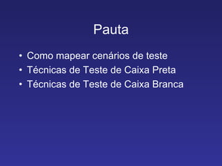 O documento discute técnicas para mapeamento de cenários de teste e técnicas de teste de caixa preta e caixa branca. Ele explica como mapear cenários de teste com foco no negócio e nos usuários, e como cenários de teste devem ser objetivos, reduzir incertezas e encontrar erros. Também descreve técnicas de teste de caixa preta como análise de valor limite, particionamento por equivalência e transição de estados, e técnicas de caixa branca como teste unitário e TDD.