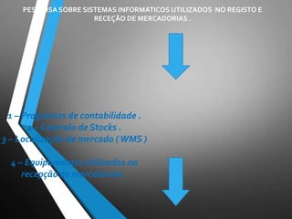 O documento discute sistemas de informação utilizados no registro e recepção de mercadorias, incluindo programas de contabilidade, controle de estoque, gerenciamento de armazém e equipamentos de recepção. Também aborda processos de recepção, expedição e planejamento de transporte.