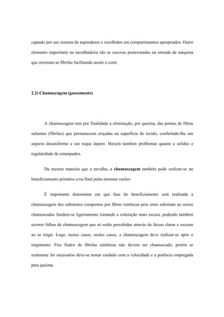 1) O documento descreve operações de preparação têxtil como navalhagem, chamuscagem e pré-fixação, que visam remover fibras salientes e fixar as dimensões do tecido antes de outros processos.