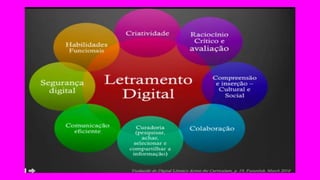 O documento discute a tecnologia digital e virtual, inclusão digital, e o uso da tecnologia na educação. Aborda como a tecnologia transforma linguagens em números digitais e como dispositivos como tablets e celulares são computadores. Também define inclusão digital como garantir acesso a tecnologias de informação e comunicação para todas as pessoas, especialmente de baixa renda. Discutem o uso da tecnologia na sala de aula para aumentar a dinâmica das aulas.