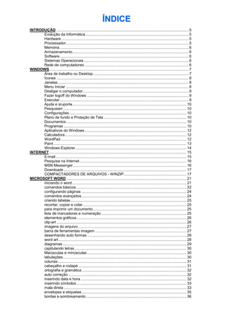Este documento fornece uma introdução sobre tecnologia da informação, incluindo a evolução da informática, hardware, software e sistemas operacionais. Também descreve os principais aplicativos do Microsoft Windows, como Word, Excel e PowerPoint, além de conceitos básicos sobre internet.