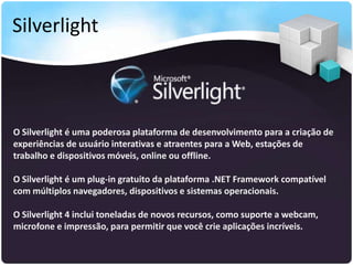 O documento discute tecnologias para desenvolvimento de aplicações ricas para internet (RIA), descrevendo Silverlight, Google App Engine, Adobe Flex e JavaFX. Essas tecnologias permitem criar experiências interativas para web, desktop e dispositivos móveis de forma escalonável na nuvem.