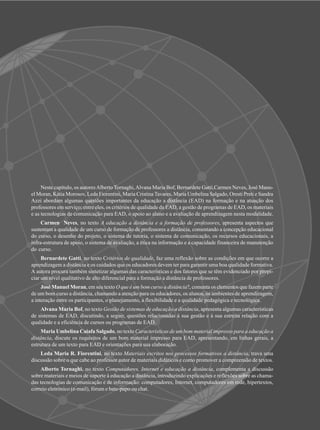 O documento discute a educação a distância na formação de professores em três pontos. Primeiro, aborda a concepção educacional do curso e sua importância para a qualidade. Em seguida, fala sobre o desenho do projeto e a necessidade de uma identidade própria para a educação a distância. Por fim, destaca a importância do sistema de tutoria para o apoio aos alunos.