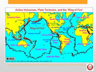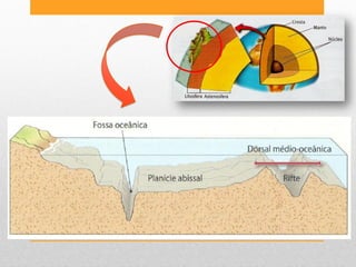 O documento descreve a teoria da tectónica de placas. Explica que as placas tectónicas se movem e interagem nos limites divergentes, convergentes e transformantes, resultando na expansão dos fundos oceânicos, formação de montanhas, vulcanismo e sismos.