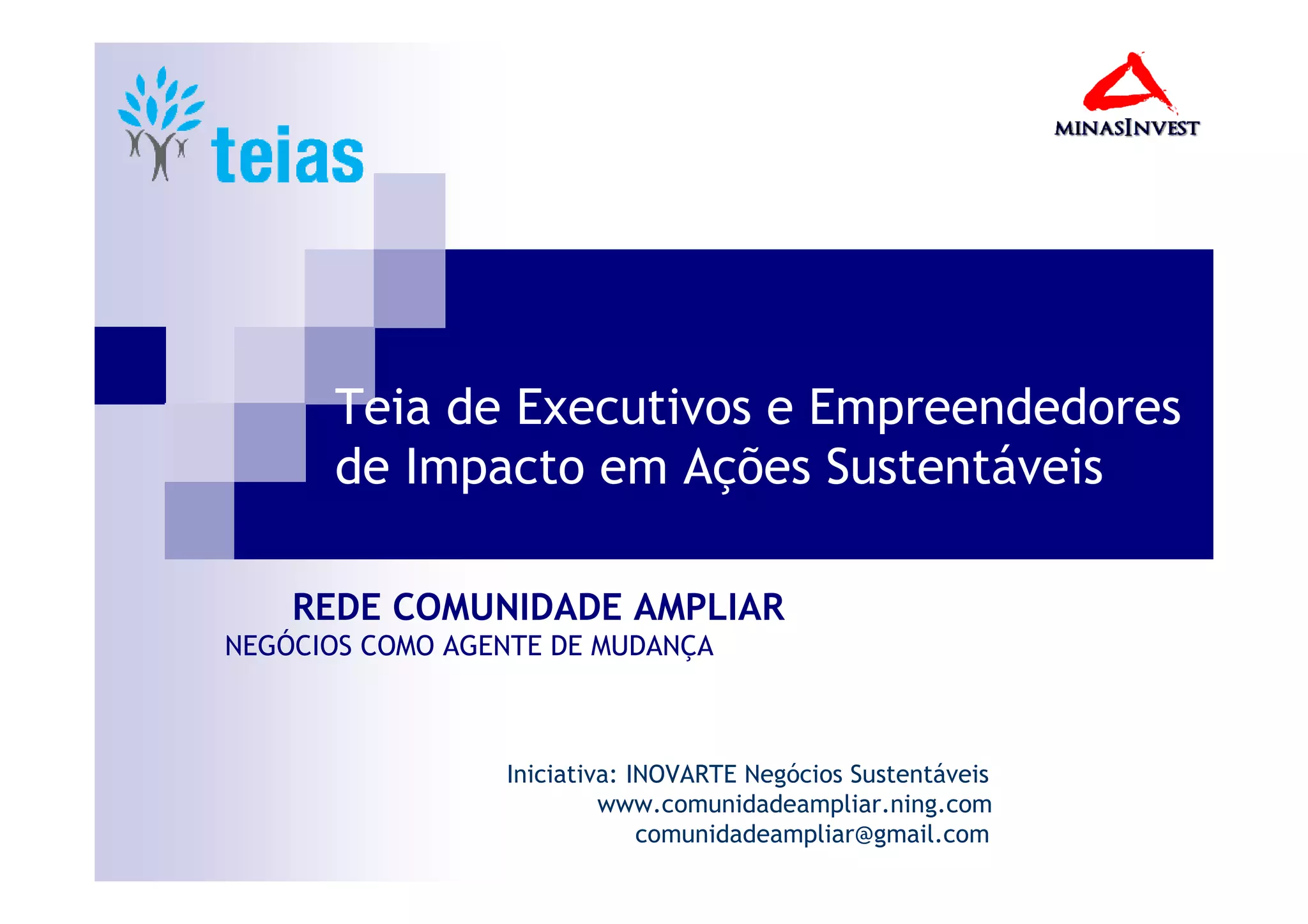 O documento descreve uma iniciativa para criar uma rede de estudantes, executivos e empreendedores comprometidos com negócios sustentáveis. A rede visa compartilhar conhecimentos, oportunidades de negócios e colaboração por meio de ferramentas online. Seu objetivo principal é integrar e apoiar os membros da comunidade por meio de compartilhamento de informações e oportunidades.