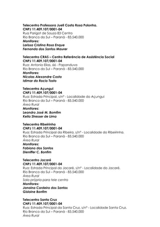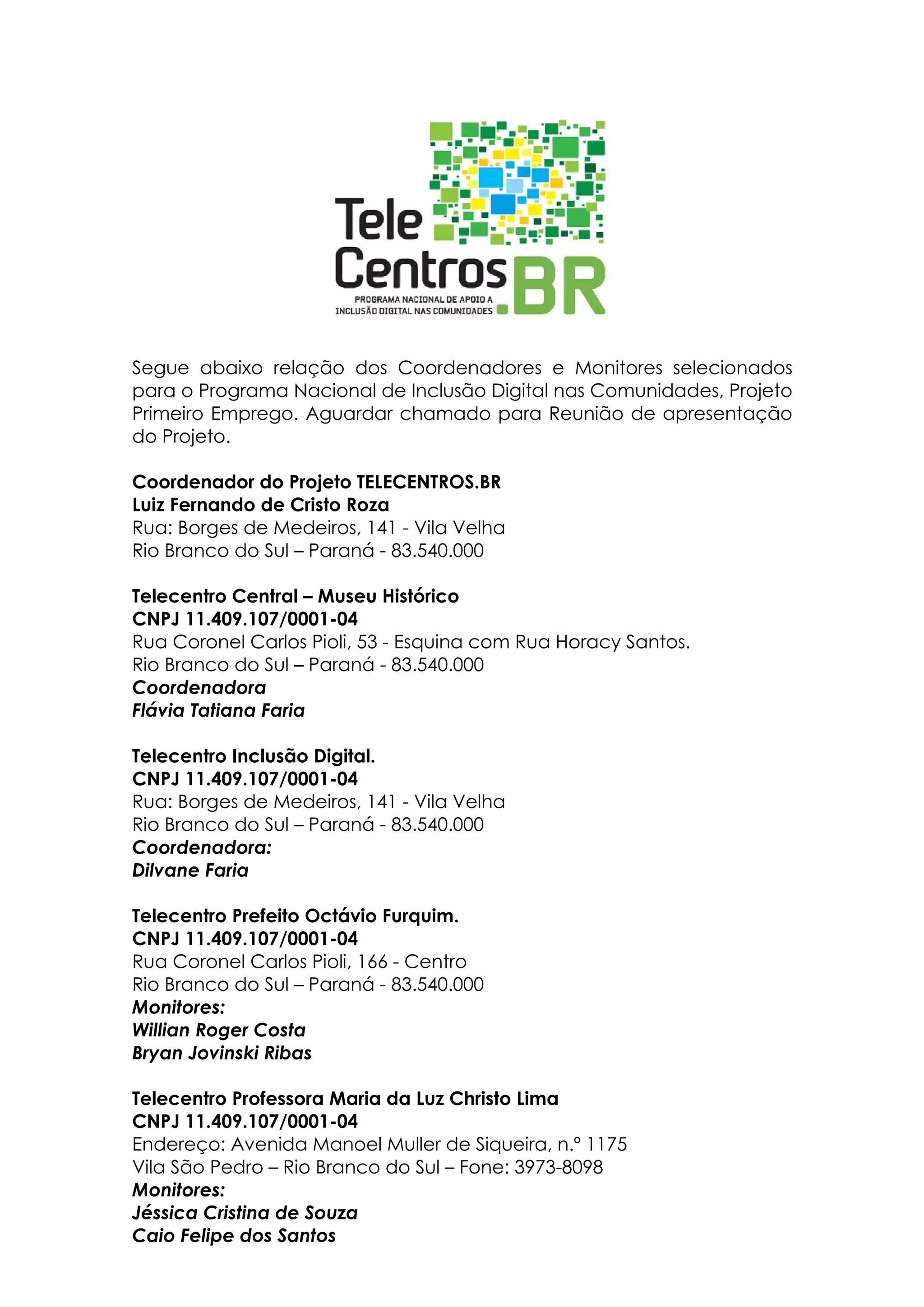 O documento lista os coordenadores e monitores selecionados para o Programa Nacional de Inclusão Digital nas Comunidades no município de Rio Branco do Sul, Paraná. São nomeados um coordenador geral e coordenadores para 26 telecentros distribuídos na zona urbana e rural do município, com um total de 58 monitores.