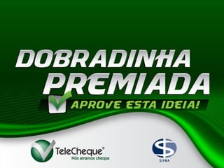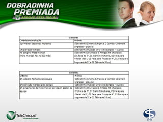 O documento descreve uma campanha de incentivo às vendas do produto TeleCheque Garantia Antecipada pela equipe de pós-vendas da Telecheque. A campanha oferece prêmios para quem alcançar metas de cadastro de clientes e volume de vendas. O objetivo é reconhecer a equipe e atingir a meta de R$3,5 milhões em volume operado no período de 4 meses.