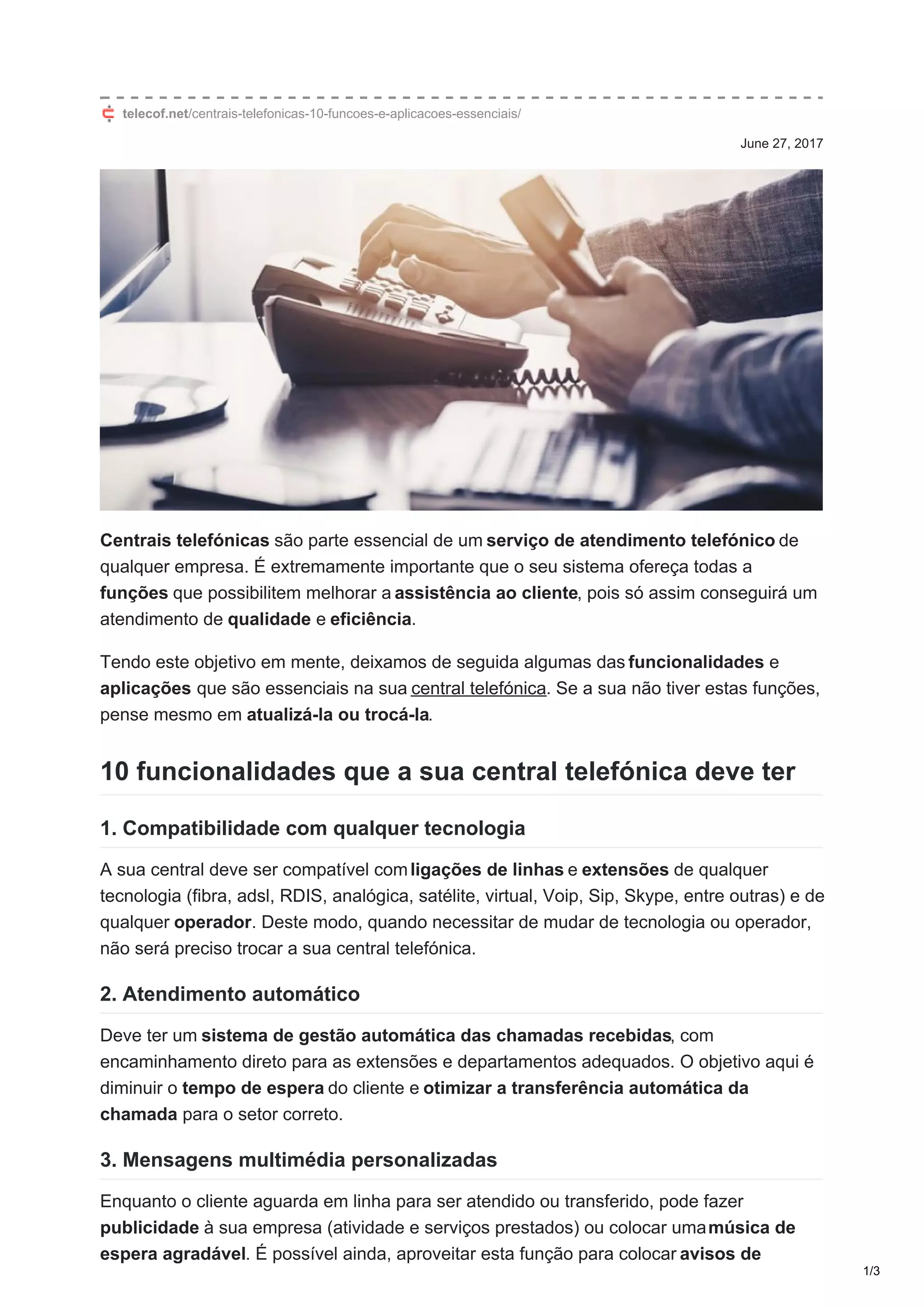 O documento descreve 10 funções essenciais que uma central telefônica deve ter para fornecer um atendimento de qualidade aos clientes, como atendimento automático, gravação de chamadas, integração com software de gestão e envio automático de SMS. A central deve ser compatível com diferentes tecnologias e permitir marcação inteligente a partir do PC.
