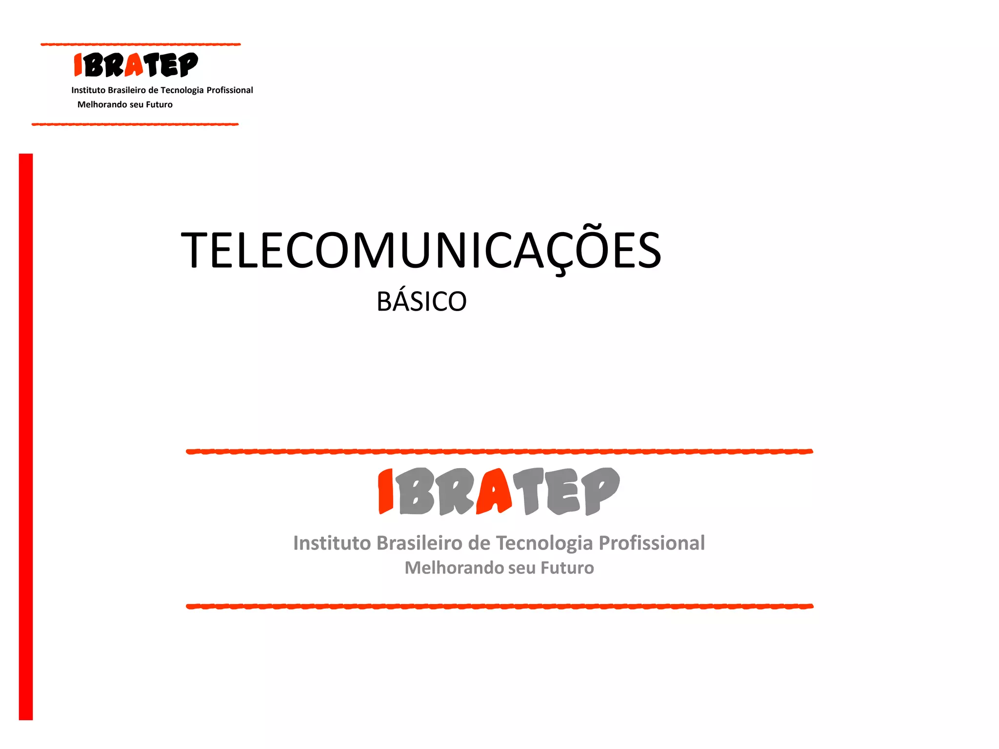 Este documento apresenta um curso de Telecomunicações Básico oferecido pelo Instituto Brasileiro de Tecnologia Profissional. O curso tem como objetivo ensinar os principais conceitos e tecnologias de telecomunicações. Ele abordará tópicos como a história das telecomunicações, protocolos, técnicas de transmissão de dados, dispositivos de comunicação, topologias de rede e meios de transmissão. O curso terá duração de 42 horas e não requer pré-requisitos além de alfabetização.