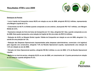 O documento resume os resultados financeiros da Companhia no 4T09 e ano de 2009, destacando o crescimento de 68% no lucro líquido e de 40,7% no EBITDA em relação a 2008, além da redução do ciclo de caixa e da relação dívida líquida/EBITDA no período.