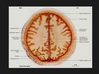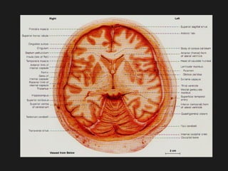 Discute a anatomia macroscópica e interna dos hemisférios cerebrais, identificando lobos, sulcos, giros e estruturas internas como o córtex cerebral, núcleos da base e centro branco medular. Também aborda a morfologia dos ventrículos laterais e as principais fibras de associação e de projeção como o corpo caloso, fórnix e cápsula interna.