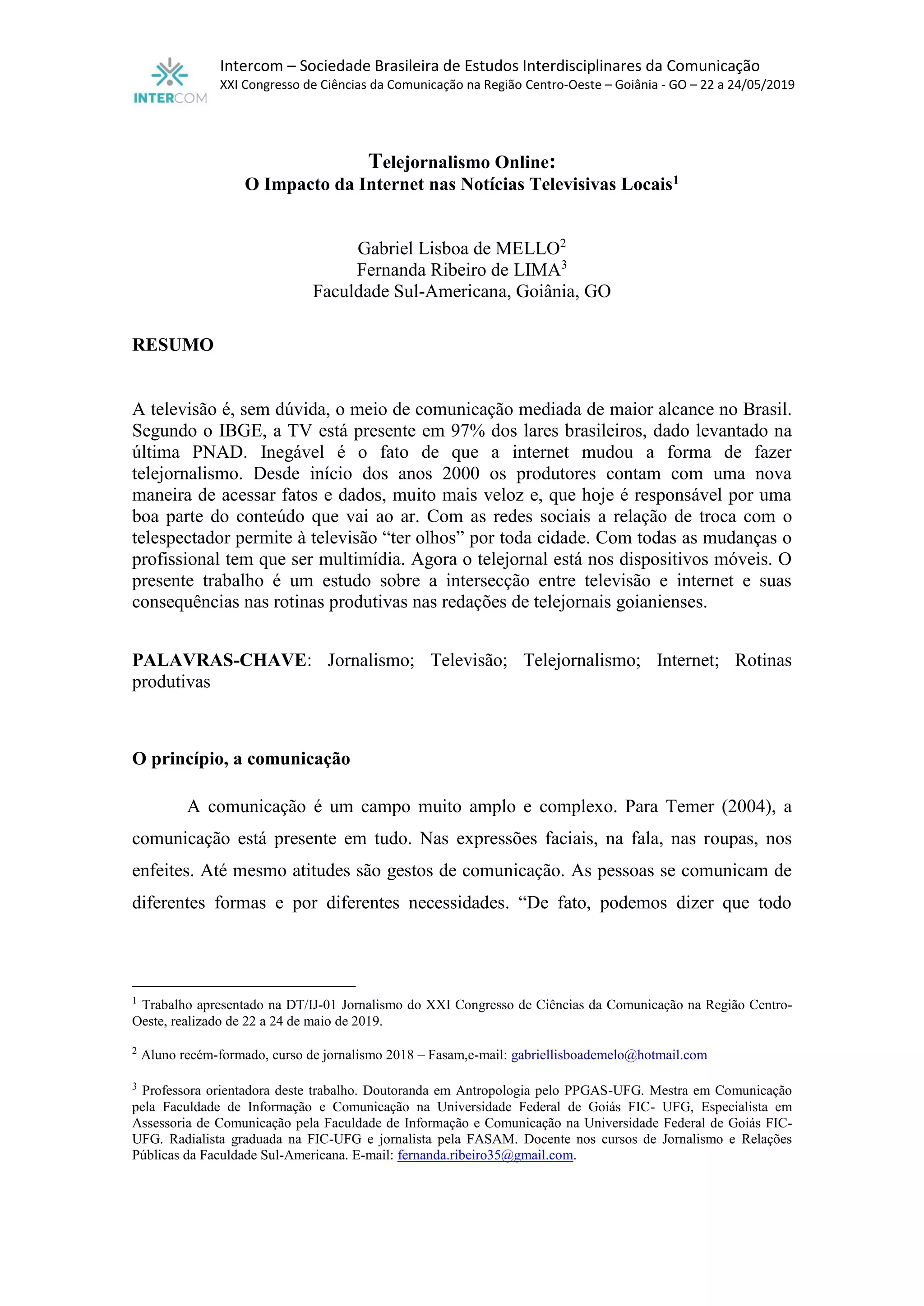 O documento analisa a intersecção entre a televisão e a internet, destacando como a internet transformou o telejornalismo, aumentando a multimídia e a responsabilidade dos jornalistas. A pesquisa foca nas rotinas produtivas dos telejornais em Goiânia, ressaltando as mudanças nas práticas jornalísticas frente à digitalização e à convergência de mídia. A metodologia inclui análise de conteúdo, questionários e observação participante para entender o impacto dessas transformações nas redações locais.