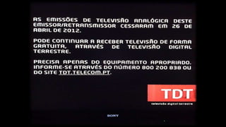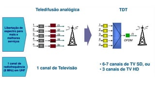 O documento discute a Televisão Digital Terrestre (TDT) em Portugal, incluindo uma breve história da TDT, as diferenças entre sinais analógicos e digitais, como a TDT funciona, vantagens e desvantagens, taxas de cobertura em Portugal, e a conclusão de que a União Europeia exigiu a mudança para o sistema digital e existem vários tipos de antenas TDT.