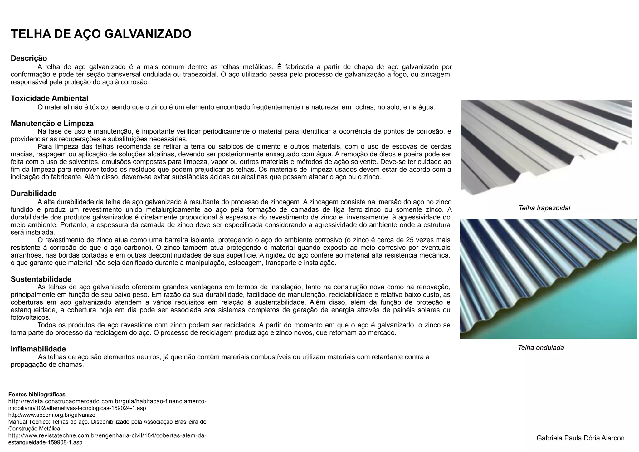 TELHA DE AÇOGALVANIZADO Descrição A telha de aço galvanizado é a mais comum dentre as telhas metálicas. É fabricada a partir de chapa de aço galvanizado por conformação e pode ter seção transversal ondulada ou trapezoidal. O aço utilizado passa pelo processo de galvanização a fogo, ou zincagem, responsável pela proteção do aço à corrosão. Toxicidade Ambiental O material não é tóxico, sendo que o zinco é um elemento encontrado freqüentemente na natureza, em rochas, no solo, e na água. Manutenção e Limpeza Na fase de uso e manutenção, é importante verificar periodicamente o material para identificar a ocorrência de pontos de corrosão, e providenciar as recuperações e substituições necessárias. Para limpeza das telhas recomenda-se retirar a terra ou salpicos de cimento e outros materiais, com o uso de escovas de cerdas macias, raspagem ou aplicação de soluções alcalinas, devendo ser posteriormente enxaguado com água. A remoção de óleos e poeira pode ser feita com o uso de solventes, emulsões compostas para limpeza, vapor ou outros materiais e métodos de ação solvente. Deve-se ter cuidado ao fim da limpeza para remover todos os resíduos que podem prejudicar as telhas. Os materiais de limpeza usados devem estar de acordo com a indicação do fabricante. Além disso, devem-se evitar substâncias ácidas ou alcalinas que possam atacar o aço ou o zinco. Durabilidade A alta durabilidade da telha de aço galvanizado é resultante do processo de zincagem. A zincagem consiste na imersão do aço no zinco fundido e produz um revestimento unido metalurgicamente ao aço pela formação de camadas de liga ferro-zinco ou somente zinco. A Telha trapezoidal durabilidade dos produtos galvanizados é diretamente proporcional à espessura do revestimento de zinco e, inversamente, à agressividade do meio ambiente. Portanto, a espessura da camada de zinco deve ser especificada considerando a agressividade do ambiente onde a estrutura será instalada. O revestimento de zinco atua como uma barreira isolante, protegendo o aço do ambiente corrosivo (o zinco é cerca de 25 vezes mais resistente à corrosão do que o aço carbono). O zinco também atua protegendo o material quando exposto ao meio corrosivo por eventuais arranhões, nas bordas cortadas e em outras descontinuidades de sua superfície. A rigidez do aço confere ao material alta resistência mecânica, o que garante que material não seja danificado durante a manipulação, estocagem, transporte e instalação. Sustentabilidade As telhas de aço galvanizado oferecem grandes vantagens em termos de instalação, tanto na construção nova como na renovação, principalmente em função de seu baixo peso. Em razão da sua durabilidade, facilidade de manutenção, reciclabilidade e relativo baixo custo, as coberturas em aço galvanizado atendem a vários requisitos em relação à sustentabilidade. Além disso, além da função de proteção e estanqueidade, a cobertura hoje em dia pode ser associada aos sistemas completos de geração de energia através de painéis solares ou fotovoltaicos. Todos os produtos de aço revestidos com zinco podem ser reciclados. A partir do momento em que o aço é galvanizado, o zinco se torna parte do processo da reciclagem do aço. O processo de reciclagem produz aço e zinco novos, que retornam ao mercado. Inflamabilidade Telha ondulada As telhas de aço são elementos neutros, já que não contêm materiais combustíveis ou utilizam materiais com retardante contra a propagação de chamas. Fontes bibliográficas http://revista.construcaomercado.com.br/guia/habitacao-financiamento- imobiliario/102/alternativas-tecnologicas-159024-1.asp http://www.abcem.org.br/galvanize Manual Técnico: Telhas de aço. Disponibilizado pela Associação Brasileira de Construção Metálica. http://www.revistatechne.com.br/engenharia-civil/154/cobertas-alem-da- Gabriela Paula Dória Alarcon estanqueidade-159908-1.asp
